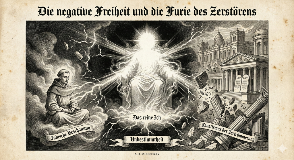 Diejenigen, welche das Denken als ein besonderes, eigentümliches Vermögen, getrennt vom Willen, als einem gleichfalls eigentümlichen Vermögen, betrachten und weiter gar das Denken als dem Willen, besonders dem guten Willen, für nachteilig halten, zeigen sogleich von vornherein, daß sie gar nichts von der Natur des Willens wissen; eine Bemerkung, die über denselben Gegenstand noch öfters zu machen sein wird. – Wenn die eine hier bestimmte Seite des Willens – diese absolute Möglichkeit, von jeder Bestimmung, in der Ich mich finde oder die Ich in mich gesetzt habe, abstrahieren zu können, die Flucht aus allem Inhalte als einer Schranke – es ist, wozu der Wille sich bestimmt oder die für sich von der Vorstellung als die Freiheit festgehalten wird, so ist dies die negative oder die Freiheit des Verstandes. – Es ist die Freiheit der Leere, welche zur wirklichen Gestalt und zur Leidenschaft erhoben [wird] und zwar, bloß theoretisch bleibend, im Religiösen der Fanatismus der indischen reinen Beschauung, aber, zur Wirklichkeit sich wendend, im Politischen wie im Religiösen der Fanatismus der Zertrümmerung aller bestehenden gesellschaftlichen Ordnung und die Hinwegräumung der einer Ordnung verdächtigen Individuen wie die Vernichtung jeder sich wieder hervortun wollenden Organisation wird. Nur indem er etwas zerstört, hat dieser negative Wille das Gefühl seines Daseins; er meint wohl etwa irgendeinen positiven Zustand zu wollen, z. B. den Zustand allgemeiner Gleichheit oder allgemeinen religiösen Lebens, aber er will in der Tat nicht die positive Wirklichkeit desselben, denn diese führt sogleich irgendeine Ordnung, eine Besonderung sowohl von Einrichtungen als von Individuen herbei; die Besonderung und objektive Bestimmung ist es aber, aus deren Vernichtung dieser negativen Freiheit ihr Selbstbewußtsein hervorgeht. So kann das, was sie zu wollen meint, für sich schon nur eine abstrakte Vorstellung und die Verwirklichung derselben nur die Furie des Zerstörens sein.